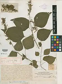 Salvia camarifolia is a perennial undershrub native to the northern and eastern slopes of the Sierra Nevada de Santa Marta in Colombia, growing at elevations from 0 to 1,600 m (0 to 5,249 ft). There is also past evidence of a specimen from the Ocaña region. S. camarifolia grows 1 to 3 metres (3.3 to 9.8 ft) tall, with ovate grey-green leaves that are 6 to 12 cm (2.4 to 4.7 in) long and 3 to 6 centimetres (1.2 to 2.4 in) wide. The red corolla is 1.5 to 2 centimetres (0.59 to 0.79 in) long, with subequal lips that are 4 to 5 centimetres (1.6 to 2.0 in).[1]