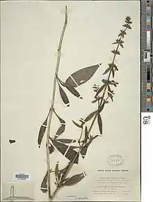 The first written account of the plant was in 1845, when it was collected by botanist Ferdinand Lindheimer, who sent a sample to botanist George Engelmann. Engelmann sent it to Carl Sigismund Kunth and Peter Karl Bouché in Germany, who first published and named the plant in 1848.[4] It was also documented growing along Salado Creek in San Antonio in 1849.[1] The specific epithet pentstemonoides is frequently misspelled as "penstemonoides". The plant was originally named after an early spelling of Penstemon by Carl Linnaeus that added an extra "t". Since it was first described and named as "pentstemonoides", that spelling is considered the correct one. As the name suggests, the plant resembles penstemon.[5][6]