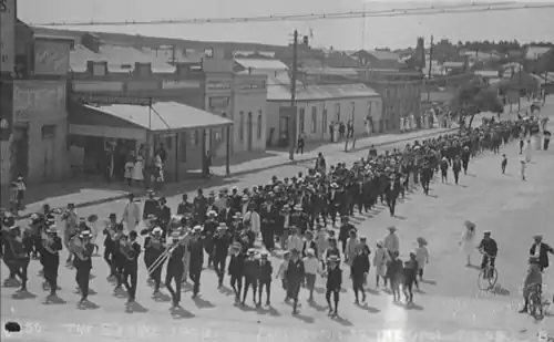 Another industrial dispute, the Great Lock-out of 1909, resulted in the closure of two of Broken Hill's major mines, leaving over a thousand men without work. Byrne continued working but paid a union levy to support out-of-work miners.[23] English socialist Tom Mann was brought into Broken Hill to act as an industrial organiser.[16] G. D. Delprat, the general manager of BHP, in anticipation of riots, contacted the New South Wales premier Charles Wade, requesting police reinforcements to be sent from Sydney.[24] Sam Byrne played in the Amalgamated Miner's Association's brass band, which lead the pickets in procession to the mine boundary.[8] He was part of the audience of spectators who witnessed the police attack the procession of the locked-out miners.[25] The riot culminated in the arrest of Tom Mann; the miners had lost their struggle.