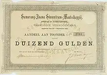 The steam tram company was founded on 18 March 1881 by JF Dijkman, W Walker and GH Clifford and put into operation on 28 September 1881. It aimed to connect Semarang with Kudus and Pati via a railway line, as defined in the permit concessions of the Colonial Government of the Dutch East Indies of 1 December 1879.[2][3][4]