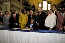 The Massachusetts General Court took up the repeal of the 1913 law the next month. On July 15, the Massachusetts Senate voted to repeal it on a unanimous voice vote.[141][142] The House approved the legislation on July 29, 2008 on a 118 to 35 vote,[143][144] and Governor Deval Patrick signed the bill into law on July 31. It took effect immediately.[145][146] Patrick said: "I think other states will make their own judgments, and I expect them to–that's their own business. All we can do is tend our own garden, and make sure that it's weeded, and I think we've weeded out a discriminatory law that we should have."[147] MassResistance mounted a petition drive for a referendum to reinstate the law in October 2008, but failed to collect enough signatures.[148]