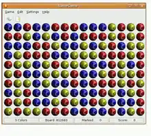 SameGame (さめがめ) is a tile-matching puzzle video game originally released under the name CHAIN SHOT in 1985 by Kuniaki "Morisuke" Moribe.[1] It has since been ported to numerous computer platforms, handheld devices, and even TiVo,[2] with new versions as of 2016.
