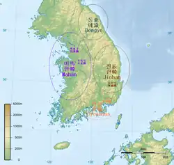 Samhan, or Three Han, is the collective name of the Byeonhan, Jinhan, and Mahan confederacies that emerged in the first century BC during the Proto–Three Kingdoms of Korea, or Samhan, period. Located in the central and southern regions of the Korean Peninsula, the Samhan confederacies eventually merged and developed into the Baekje, Gaya, and Silla kingdoms.[1] The name "Samhan" also refers to the Three Kingdoms of Korea.[2]