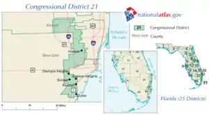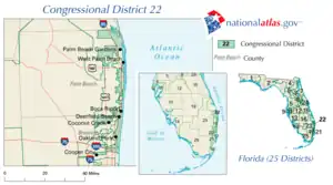 According to the state of Florida, 42% of the voters in this district are registered Republicans, and 36% are registered Democrats.[14] George W. Bush won this district with 52% of the vote in the 2000 presidential election, and with 54% of the vote in the 2004 presidential election.