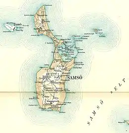 The name Samsø is of unknown origin.[3] The name is known from 1075 as Samse. This word is a simplex and the addition of -ø, Danish for 'island', is thus a later compounding,[4] known in toponymy as epexegesis.