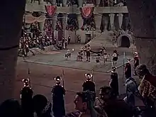 The film's special effects were supervised by Gordon Jennings.[38] The most spectacular special effect in the film is the toppling of the temple of Dagon, the god of the Philistines.[38] It is the penultimate scene in the film, cost $150,000, and took a year to shoot.[38] The bottom portion of the temple was constructed full-scale.[38] A separate 37-foot high model with a 17-foot high Dagon statue was built for the photographic effects.[38] The model was destroyed three times in order to shoot it through different camera angles.[38] Footage of the full-scale set was merged with footage of the scale model using a "motion repeater system" fabricated by Paramount, which enabled the exact repetition of camera moves.[38]