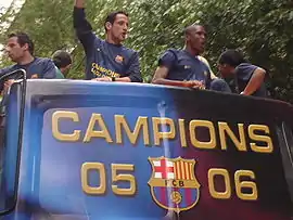 Eto'o made his Barcelona debut in the season opener at Racing de Santander on 29 August 2004. After Barcelona won the 2004–05 La Liga title, the team organized a festive party in the Camp Nou, during which Eto'o harangued the fans chanting, "Madrid, cabrón, saluda al campeón" (English for, "Madrid, bastards, salute the champions"). The Royal Spanish Football Federation fined Eto'o €12,000 for his comments, for which he later apologized. He expressed regret and asked for forgiveness from Real Madrid, his first professional team. The head of the Real Madrid fan club federation remained unimpressed, however, stating, "This character is a fantastic player, but he leaves a lot to be desired as a person."[21] He signed an improved contract with Barcelona in June 2005.[22]