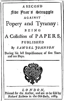 Johnson was chaplain to Lord William Russell, a Whig leader, from 1679. Russell directed Johnson's attention to constitutional theory.[10] The result of Johnson's researches was posthumously published in 1769 as A History and Defence of Magna Charta;[11] a second edition appeared in 1772.[12] Russell was later caught up in the Rye House trials. Russell's final speech before his execution was printed, and Johnson, Darby, and Gilbert Burnet were questioned about their involvement in its publication.[13]