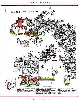 There were two Dzongpöns for every Dzong—a lama (Tse-dung) and a layman. They were entrusted with both civil and military powers and are equal in all respects, though subordinate to the generals and the Chinese Amban in military matters.[5] However, there were only one or two Ambans representing the Qing (Manchu) Chinese emperor residing in Lhasa, directing a little garrison, and their power installed since 1728, progressively declined to end-up as observer at the eve of their expulsion in 1912 by the 13th Dalai Lama.[4] In 1952, shortly after the PRC sent forces to the region, Shigatse had a population of perhaps 12,000 people, making it the second largest town in Tibet.[6]