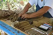 San Andrés Tuxtla is best known for the production of tobacco and cigars and cigarettes with their cigars considered the best in Mexico, and Winston Churchill is said to have favored cigars from the area.[2][4][5][8] The area's tobacco history began in the 19th century when Cuban and German immigrants and decided that they could grow fine tobacco and make cigars here for export to Europe.[3][9] Today, the area produces some of the finest cigars in the world. All steps from the growing of tobacco, to curing to wrapping are all done in the municipality with San Andres's own experts to assure quality. Torcedores, or those who create the cigars from cured tobacco leaves, apprentice for two years.[3] Many families have worked in the industry for generations, with children learning the work as children in family workshops which make both cigars and cigarettes.[8]