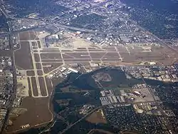 San Antonio International Airport (IATA: SAT, ICAO: KSAT, FAA LID: SAT) is an international airport in San Antonio, Texas, United States. It is in Uptown Central San Antonio, about 8 miles (13 km) north of Downtown. It has three runways and covers 2,600 acres (1,100 ha).[1][3] Its elevation is 809 feet (247 m) above sea level. SAT averages 260 daily departures and arrivals at its 27 gates, which serve 14 airlines flying non-stop to 53 destinations in the US and Mexico.[4]