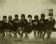 Since they were staying at the town school, they could see a class: little boys showed up early, dressed exactly like their parents with the difference that the red handkerchief on their heads looked older and seemed to have been passed from fathers to sons; the kids put literally their faces in their books, too shy to see the visitors until the teacher came and took roll call.[9] After that, the teacher stepped out and the children went back to their book, for the next three hours, as the teacher could not speak their language and they did not know any Spanish.[9] That day there was not class for the girls, who were dismissed because the visitors were staying at their class.[9]