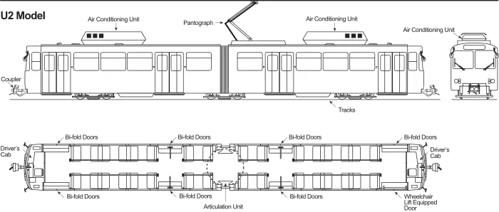 The MTS and SANDAG agreed to purchase a total of 65 vehicles, which would arrive between September 2011 and January 27, 2015.[13][15] However, there was not enough funding to replace all 123 high-floor cars at once. The decision was made to retire the original Siemens-Duewag U2 LRVs, and operate three-car trains with the new low-floor LRVs in the front and back, and an older high-floor Siemens SD-100 car in the middle.