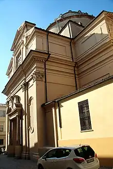 A church at the site was built in its present form in the 18th century for the Oratorians and consecrated in 1721. The initial design was by Pietro Negri, and completed by Andrea Felli, with help by the engineer Giovanni Battista Scapitta. The church has a central layout with two lateral altars. The ceilings, spandrels, and cupola were frescoed in the 19th century. The church houses canvases depicting the Guardian Angel and St Michael Archangel by Guglielmo Caccia.[1]
