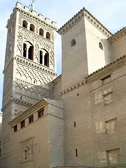 After the Reconquista of the city from Islamic hands, a church was built in Romanesque style on an ancient Roman road; in the mid 14th-century, this edifice was destroyed to build a new church in Mudéjar style, later renewed in Baroque style during the 18th century.