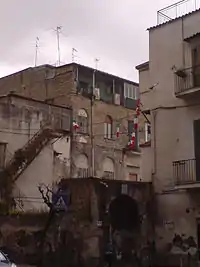 By the late 14th century San Giorgio had grown into a town, and had two main residential zones, above and below the church. These were referred to as di sopra (above), and di bascio (below). At the same time, San Giorgio grew large enough to absorb the nearby town of San Aniello a Cambrano, and the centre of the new larger town remained the hilltop church venerated to Saint George. By the 15th century, this church had once again been renovated, this time in high Gothic architecture, and incorporated three new naves.[11] Despite the improvements to the hilltop church, in 1570 the religious centre of San Giorgio was moved further downhill with the opening of the newly built church of Santa Maria del Principio, around which a prosperous new town centre soon grew. Following the opening of the new church, the procession route was altered to begin at Santa Maria del Principio and run a more regular course through the streets to the hills and back down to the lower end of the commune, giving greater access to the residents to the processional route.[8]