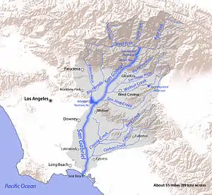 San Jose Creek is an intermittent, tributary stream of the San Gabriel River in Los Angeles County, California. The mouth of San Jose Creek is at an elevation of 194 feet (59 meters) at its confluence with the San Gabriel River, 3.5 miles (5.6 km) southwest of Bassett, California. Its source is at 960 feet near the Los Angeles County Fairplex, at 34°04′50″N 117°45′38″W / 34.08056°N 117.76056°W, where it has its confluence with Thompson Wash,[1] actually a continuation of the creek into the San Gabriel Mountains. From Thompson Wash, San Jose Creek flows nearly 20 miles (32 km) westwards from Pomona into the San Gabriel River through the Pomona Valley and San Gabriel Valley.[2]