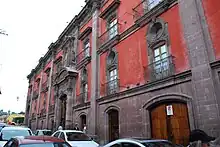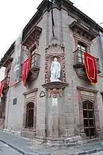 The Casa del Mayorazgo de la Canal dates from the 18th century, constructed by Mariano Loreto de la Canal y Landeta.[6] During the late colonial period, this house was the most important secular building, being home to the De la Canal family, one of the wealthiest in New Spain.[33][35] The original construction was inspired by French and Italian palaces of the 16th to 18th centuries. The house is considered to be a transitional work between Baroque and Neoclassical,[16] as its façade was redesigned by Manuel Tolsá in the early 19th century.[6] The façade is Neoclassical with the coat of arms of the family. The main portal has two levels with an arch and a relief of an eagle on the keystone. The main door is profusely decorated with high reliefs.[6] Today, it houses the Casa de Cultura de Banamex (Banamex Cultural Center), which houses a collection of historic paintings and offers diverse expositions during the year.[38][36]