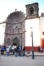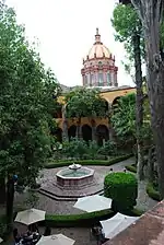 The Nuestra Señora de la Salud Church was built by Luis Felipe Neri in the 18th century. The main portal is in Churrigueresque (Spanish Baroque) style with two levels and a crest in the shape of a large seashell.[6][16] The first level has an arch flanked by pilasters and niches with sculptures of the Sacred Heart and John the Evangelist. The interior has a layout of a Latin cross covered with vaults with side walls covered in oil paintings done by Agapito Ping between 1721 and 1785.[6] One altar contains an image of Christ, the Good Shepherd, defending his sheep from various dangers including a group of unicorns.[35] The church served as the chapel of the Colegio de San Francisco de Sales next door.[36] The Colegio de San Francisco de Sales was as important as the college of San Ildefonso in Mexico City in the 18th century.[16] Both Ignacio Aldama and Ignacio Allende attended school here.[36]