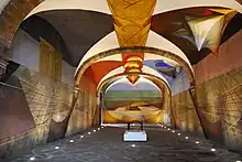 One hall of the old convent is dedicated to a mural by David Alfaro Siqueiros along with students from the art school, but it was never finished.[35] The complex has a museum, an auditorium, two art galleries and the Las Musas restaurant.[31][36] Next to the cultural center is the Inmaculada Concepcion Church, locally known as Las Monjas (English: The Nuns). It was originally constructed as part of the convent. The church was constructed between 1755 and 1842 with an elegant cupola added by Zeferino Gutierrez in 1891, inspired by the Les Invalides in Paris.[36] The cupola is octagonal and decorated with Corinthian columns in the lower area and the upper area has a window with a balustrade and statues of saints. Topping the cupola is a lantern window with a statue depicting the Immaculate Conception.[6] Inside, there are paintings by Juan Rodriguez Juarez.[35]