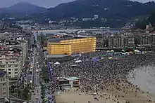 - The Stage on Zurriola Beach, which stages free concerts. Situated on the beach, the stage has an unlimited capacity and attracts large crowds such as for concerts by Bob Dylan (83,000 people in 2006), Jamie Cullum (50,000 in 2013), B.B. King (41,000 in 2011), Simple Minds (40,000 in 2022) Patti Smith (20,000 in 2010) and Bobby McFerrin with Orfeón Donostiarra (18,000 in 2008).[5]