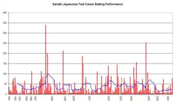 Considered one of the greatest attacking batsmen of all time, Jayasuriya is well known for his powerful striking and match-winning all-round performances in all formats of the game.[5] Jayasuriya was an all-rounder, who had an international cricket career that spread over two decades.[6] He is the only player to score over 10,000 runs and capture more than 300 wickets in One Day International cricket and is also regarded as one of the best all-rounders in the history of limited-overs cricket. Jayasuriya created many world records during his career.[7][8]