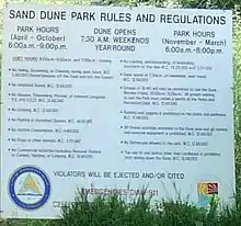 Currently, use of the sand dune portion of the park is by reservation only, which must be made in advance at City Hall, a little over a mile away during business hours. The entrance to the fenced area is supervised during scheduled hours. The city has heavily fining violators of the restrictions (including non-residents who are unaware of the rigidity of the restrictions) hundreds of dollars for a single violation.