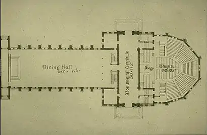 Plan (1874, north at top) showing Alumni Hall (left and center), Memorial Transept (center-right), and Sanders Theatre (right)
