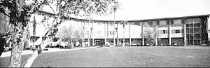 The 200 guest rooms of the original hotel were divided into four two-story motel wings, each with fifty rooms, and named after famous race tracks.[61] They were set out in a hacienda style, and surrounded by a half-moon shaped pool.[4] The suites were luxuriously designed. Plush blue carpets and ivory colored chairs with white ceilings were the norm in the early days. An electric tram service, often attended by pretty showgirls, took the guests to their rooms.[62] A 14-story tower commenced construction in late 1965,[4] and was opened in 1967. It existed until November 1996 when it was demolished.[63]