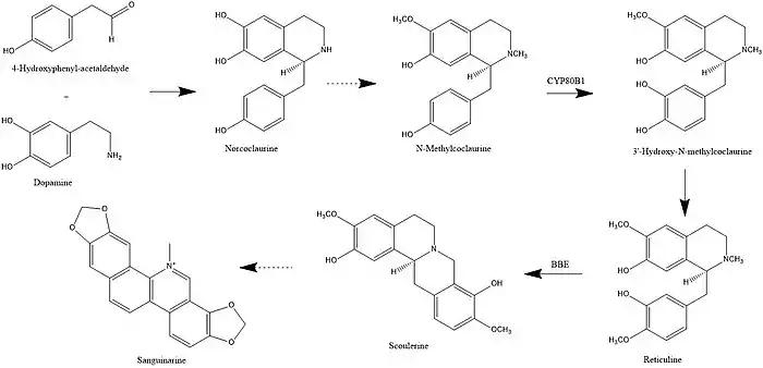 In plants, sanguinarine biosynthesis begins with 4-hydroxyphenyl-acetaldehyde and dopamine. These two compounds are combined to form norcoclaurine. Next, methyl groups are added to form N-methylcoclaurine. The enzyme CYP80B1 subsequently adds a hydroxyl group, forming 3'-hydroxy-N-methylcoclaurine. The addition of another methyl group transforms this compound into reticuline.