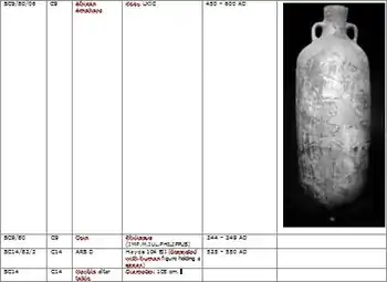 - ↑ assestion made due to the most recent pottery recovered from the site, dating from the late 5th and 6th centuries AD (such as several types of ARS D 80b, 87, 93, 94, 97, 99b, 104, 105 and 106)