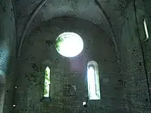 The small chapel is remarkable for being partially carved into the cliff and having Romanesque elements. The entrance is now walled up but has a rounded portal of decorated travertine marble. A round window is above the entrance. The interior, partially vandalized with graffiti has a peculiar stone altar shelter.[2]