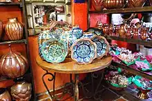 Items take from four days to a month to complete, depending on the size, thickness and decorative features. One example is the copper roof of the town's kiosk which is located in one of the main plazas. The making of a piece in a workshop usually require four people to heat the metal, turn it and hammer it into shape.[9] Pieces from this town have been collected by museums in various parts of the world as well as private Mexican and international collectors.[12] This has led to growing exports of items made from this community.[10] To further promote Santa Clara del Cobre's work, expositions such as one called “Santa Clara del Cobre. Obras Maestras” (Santa Clara del Cobre Masterpieces) have been held. This particular exposition featured more than 200 works done in copper, as well as covered the history of copper work in the town.[12]