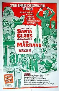 Some science fiction B movies feature Santa Claus as a superhero-type figure, such as the 1959 film titled Santa Claus produced in Mexico with José Elías Moreno as Santa Claus. In this movie, Santa allies with Merlin the magician to battle the devil, who is attempting to trap Santa.[1] In the Cold War-era film Santa Claus Conquers the Martians (1964), Santa Claus is captured by Martians and brought to Mars, and ultimately foils a plot to destroy him.[1]