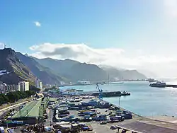 Santa Cruz is located in the northeast quadrant of Tenerife, 210 kilometres (130 mi) off the north-western coast of Africa within the Atlantic Ocean. The distance to the nearest point of mainland Spain is 1,300 kilometres (810 mi). Between the 1833 territorial division of Spain and 1927, Santa Cruz de Tenerife was the sole capital of the Canary Islands, until 1927 when a decree ordered that the capital of the Canary Islands be shared, as it remains at present.[7][8] The port is of great importance and is the communications hub between Europe, Africa and Americas, with cruise ships arriving from many nations. The city is the focus for domestic and inter-island communications in the Canary Islands.[9]