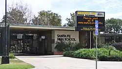 Santa Fe High School is a public high school located in Santa Fe Springs, California. The school has an enrollment of approximately 3,000 students and was founded in 1954 as a part of the Whittier Union High School District. It serves students in grades 9–12 in the cities of Santa Fe Springs, Norwalk, Downey, and Whittier.