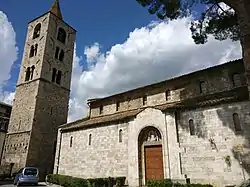 The church was begun in the 13th century, but the present church was altered over the centuries. The present main entrance is a façade on the right nave, which has both Romanesque and Gothic elements, and has a single portal. The belltower, detached from the church likely reutilizes a former private watchtower, now complete with mullioned windows. the interior is divided into a nave and two aisles by alternating pilasters and columns. A 1950–1954 restoration uncovered traces of 13th-century frescoes, including an Enthroned Madonna and Child between St John the Evangelist and St Michael the Archangel weighing souls. The church also houses the 15th-century, travertine marble tomb monument of Nicola Pizzuti, built as a gothic-renaissance style tabernacle, with frescoes of the school of Carlo Crivelli in the spandrels, depicting the Evangelists and Cardinal Virtues.[1]
