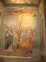 The church can be accessed through two doors: the interior houses there are five chapels and the large semicircular chapel of the altar. The chapels have frescoes depicting the Crucifixion of Jesus, the Resurrection and the Madonna with Child.
