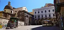 The entire complex was at one time one of the largest monasteries in Italy, occupying what today can be measured only in "city blocks". Urban renewal from the 1930s literally built around the old premises, leaving much of the original structure standing in the center. For example, the gigantic main post office in Naples is at west end of the old monastery and the older edifice was simply incorporated into the back of the Naples Central Post Office such that the monastery seems to flow out of the more modern building. At the east end, the church, itself, is still in use, but the adjacent monastery premise and courtyard are now a Carabinieri (Italian national police force) barracks.