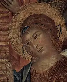 The bridge of the nose has the faded left outline and the nostrils don't look like a simple thickening, but a kind of incision that enter the fin of the nose, details lacking in the earlier Maestàs. The mouth has a serene air, almost a smile, that contrasts with the sad and serious air of the Louvre Maestà and the Virgin and Child with Two Angels, but that is found in the Maestà di Assisi and Maestà of Santa Maria dei Servi.