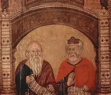 Composed and solemn, Abraham and David in the center below the throne recall that Jesus descended from their lineage. The Christian meaning of the work, well-fitted to a church dedicated to the Holy Trinity, is thus focused on the threefold nature of the Virgin who is surrounded by the Holy Spirit.[2] Below, at the sides of the throne, Jeremiah and Isaiah gaze up towards the child as if to confirm the prophecies written in their documents on the miraculous virgin birth of Jesus. With their gaze, they create a triangle whose vertex is the throne of Marie.