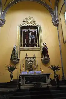 In the apse, in a simple niche, is the Christ of the Seven Veils, done in cornstalk paste in the 16th century, accompanied by images of the Virgin of the Sorrows and John the Baptist.[2] According to tradition, it was given to Carlos V from Pope Paul III. Carlos V then awarded it to the Brotherhood. It was also believed that those permitted to remove the veils and see the image underneath were rewarded with indulgences. Another important image here is the Virgin of the Remedies (Virgen de los Remedios), which is also known as La Gachupina. Gachupin is a derogatory term for Spaniard. She received the term as she was the patron of the Spanish in Mexico.[1] The Virgin originally had her own sanctuary but was brought here to ask for rain during a dry period, and never left.[2]