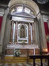 In the meantime, the interior of the church was enriched: the altar of Santa Maria in Silva was built to replace the previous wooden altar, increasing the depth of the chapel in order to have more space, completing the work in 1726.[58] Meanwhile, in 1735 the two large wooden chancels were rebuilt and installed, incorporating the painted cartouches that already adorned the previous chancels. The reason for the rebuilding, however, is not known.[59] The church, at this point truly completed, was to know within a few years a great tragedy.