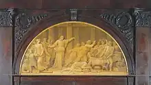 In 1831, the wooden compass of the side entrance was built by carpenter Giovanni Gozzoli, decorated with carvings and floral motifs. The artifact was then enriched with a yellow monochrome lunette by Giuseppe Teosa, depicting Jesus driving the merchants out of the temple.[62]