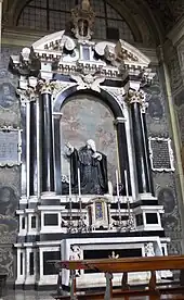 In 1622 the rib vaults of the aisles were put in place, and as soon as they were finished, the great vault of the nave was built.[45] Everything seems to be finished in early 1623.[46] In the same year the new sepulchral ark sculpted by Giovanni Antonio Carra was also installed, finding its place in the center of the chancel.[47] A few months later, the bodies of the two saints were finally moved there during a solemn ceremony.[48] Decorations then began to be discussed: on September 5, 1625[49] a contract was signed with the painters Antonio Gandino and his son Bernardino, who two months later began the drafting of the work in the large panel in the nave.[46] Similarly, in 1626 the painter Tommaso Sandrino began frescoing the rest of the covers starting with the last vault of the right aisle: all work was finished by 1629.[46] In 1630 the tragic "Manzonian plague" occurred, which considerably slowed down the works for at least a decade.[46] Documents mention building works inside the church again only in 1639, when the new ornamentation for the altar of the Blessed Sacrament was commissioned, designed by Agostino Avanzo and made by Giovanni Antonio Carra's sons: Giovanni and Carlo. The affair dragged on quite a bit and the altar could only be finished at the end of the century.[46] In 1643, work began on the rebuilding of the chapel of St. Honorius, at the head of the right aisle, supported financially by the powerful Calini family, which had acquired the sepulchral area in front of it with the commitment to renovate the chapel's furnishings and architecture.[50] Antonio Comino again took care of the matter, but it was to be his last work: the architect died the following year.[51] On the other hand, the construction of the altar of St. Benedict, the third on the left, by Giovanni Carra[46] began in 1649. At the end of the century, the altar of the Nativity was also put in place at the hands of Santo Calegari the Elder: when the work was completed, the canvas by Lattanzio Gambara, made almost a century and a half earlier, was mounted inside it.[52]