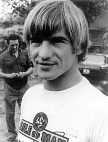 The 1969 Grand Prix season would be even more successful for Herrero. He began the year winning his first grand prix at the opening race of the season in front of his countrymen at Jarama.[1] After retiring from the German Grand Prix with mechanical problems, he returned with a victory at Le Mans.[1] He followed this with third place at the Isle of Man TT, a considerable accomplishment considering his horsepower deficit on the infamous Snaefell Mountain Course.[1] He triumphed again at Spa and was leading the championship points race when he was beset by bad luck.[1] He crashed in the rain at the Ulster Grand Prix and suffered a broken left arm.[2] Most observers considered his championship hopes dashed, but Herrero showed true grit by coming back to finish in a remarkable fifth place at Imola.[2] At last race of the season in Yugoslavia, he held a one-point lead in the championship.[4] He started the race in the lead but crashed on the seventh lap, ending his championship hopes.[2] He would finish third in the world championship.[1] He repeated as Spanish 250cc champion for a third consecutive year.[4]