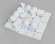 Each turn of play involves moving one of your two pieces around a 5-by-5 grid and then placing a tile adjacent to the moved piece, building up that spot of the board.[4] On subsequent turns, pieces may be moved onto one of these built-up tiles, but only one level up at a time. Pieces may also be moved down any number of levels. Players may also place a special dome tile on top of a three-level building, which prevents a player from moving onto that spot for the remainder of the game.