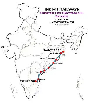 The 22855 / 56 Santragachi–Tirupati Express runs from Santragachi via Kharagpur Junction, Khurda Road Junction, Visakhapatnam, Vijayawada Junction, Gudur Junction, Renigunta Junction to Tirupati.[4]