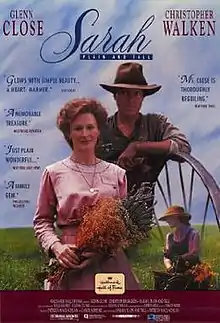 Sarah, Plain and Tall is an American drama television film that premiered on CBS on February 3, 1991, as part of the Hallmark Hall of Fame anthology series. It is directed and produced by Glenn Jordan from a teleplay by Patricia MacLachlan and Carol Sobieski, based on the book of the same name by MacLachlan. The film stars Glenn Close, who also serves as an executive producer, and Christopher Walken. It tells the story of a Maine spinster who goes to Kansas in the early 1900's in response to a widower's newspaper advertisement seeking a wife.[1]