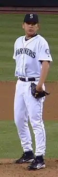 After playing college baseball for Tohoku Fukushi University, Sasaki was drafted in the first round of the 1989 draft by the Yokohama Taiyō Whales (now named Yokohama DeNA BayStars) in Japan's Central League. He played for them from 1990 to 1999, before joining the Seattle Mariners in 2000. He joined a bullpen that had been one of the worst in the Major Leagues, and during his rookie year won the closer job from a floundering José Mesa. Sasaki's out pitch, a devastating split-fingered fastball that drops when arriving at home plate, was nicknamed "The Thang" by Mariners radio announcers.[1] He complemented it with a four-seam fastball that topped out at mid-90s. Sasaki maintained a rigorous throwing program, sometimes at odds with club management, that saw him throw up to 100 pitches following games in which he did not appear.
